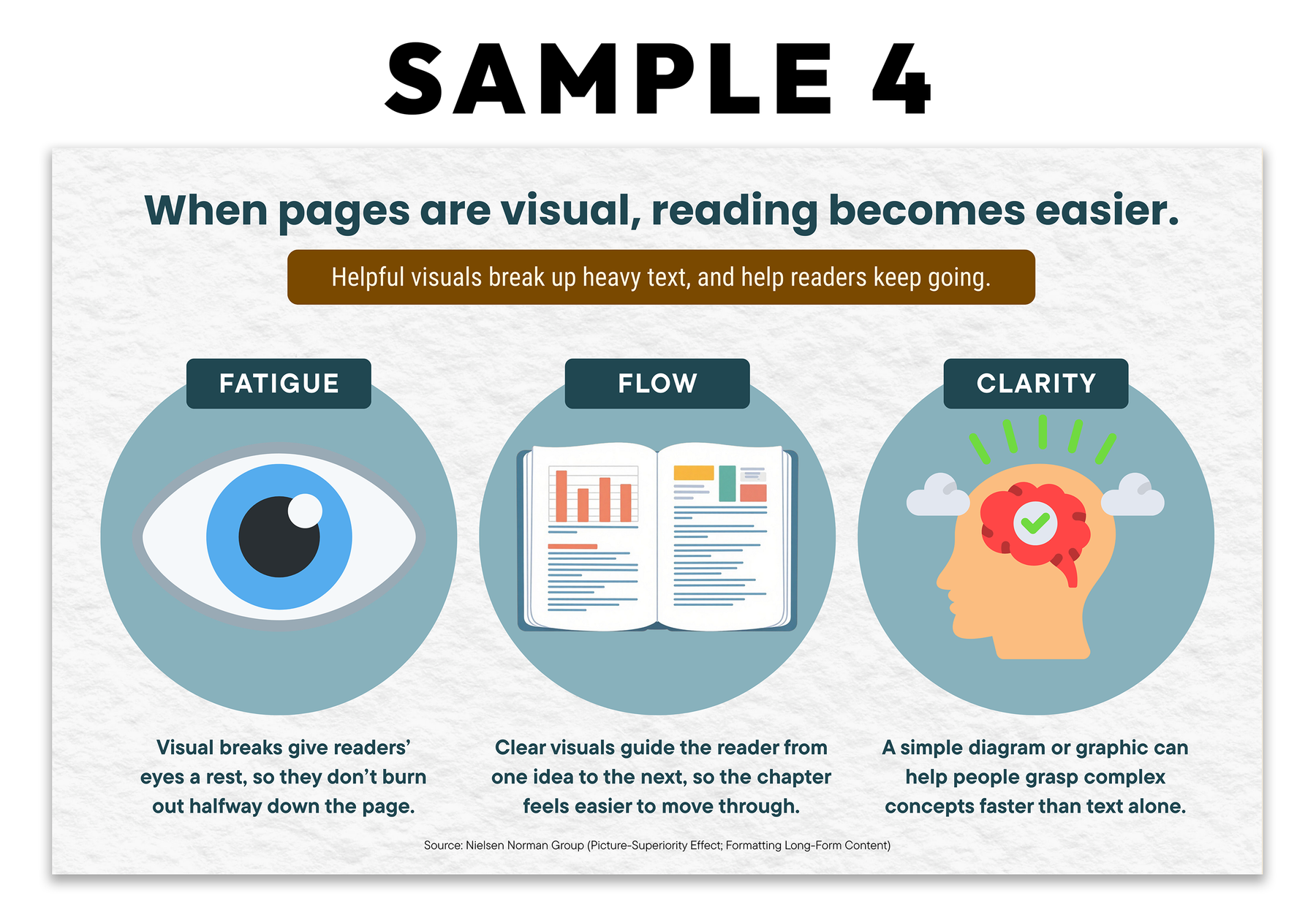 Every infographic is custom-designed by our team (no templates, no generic layouts) while stock images are carefully sourced to ensure they’re relevant, high-quality, and aligned with your book’s needs.