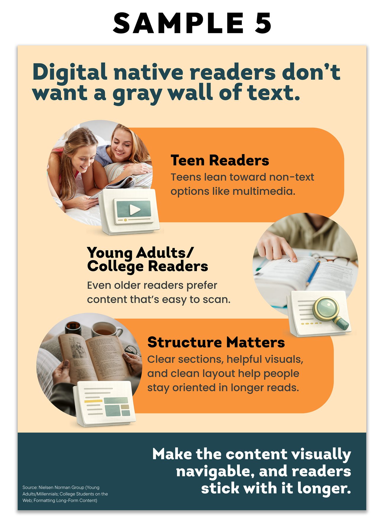 Whether you want mood-setting stock images, step-by-step infographics, or eye-catching educational diagrams, we make sure every image enhances, not distracts from, your content.